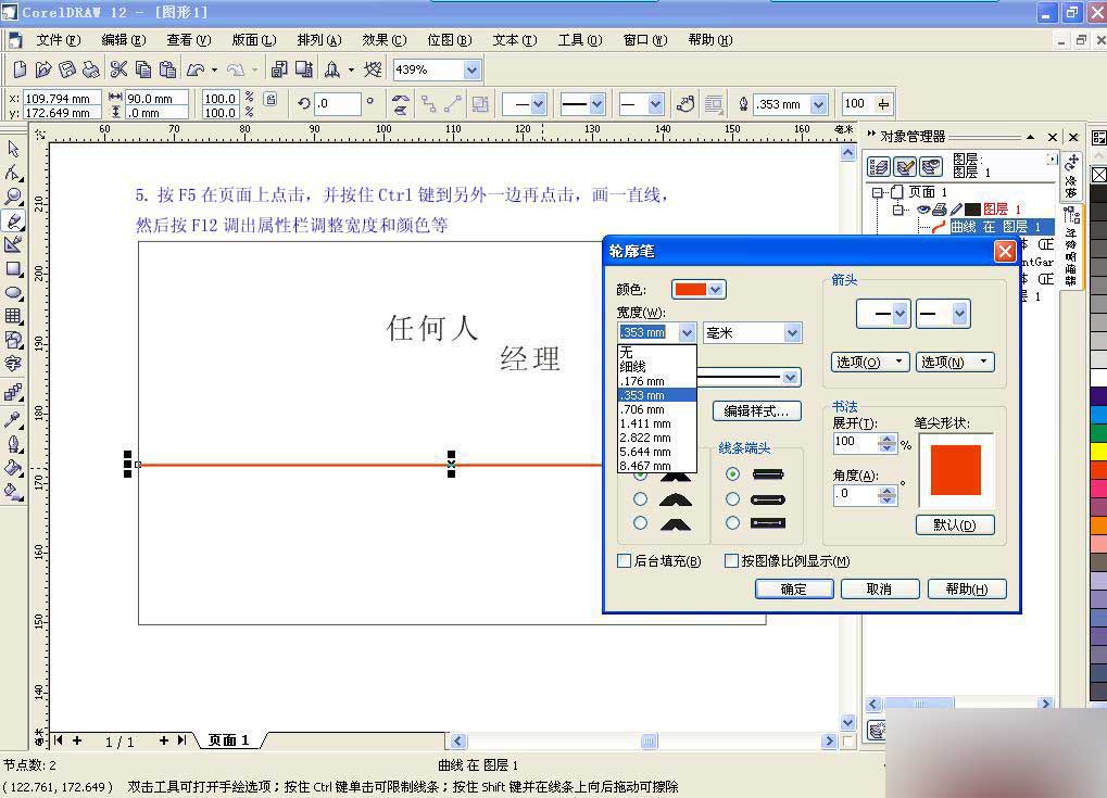 3、為了編輯的方便,選擇"窗口""卷簾工具""對象管理器",點一下右邊的小三角形,選擇"新建圖層",這時在對象管理器的窗口中會多出一個圖層2的項目出來。用鼠標選取圖層1,將其前面的筆形按鈕點一下,則該圖層1即處于不可編輯狀態,如圖1。