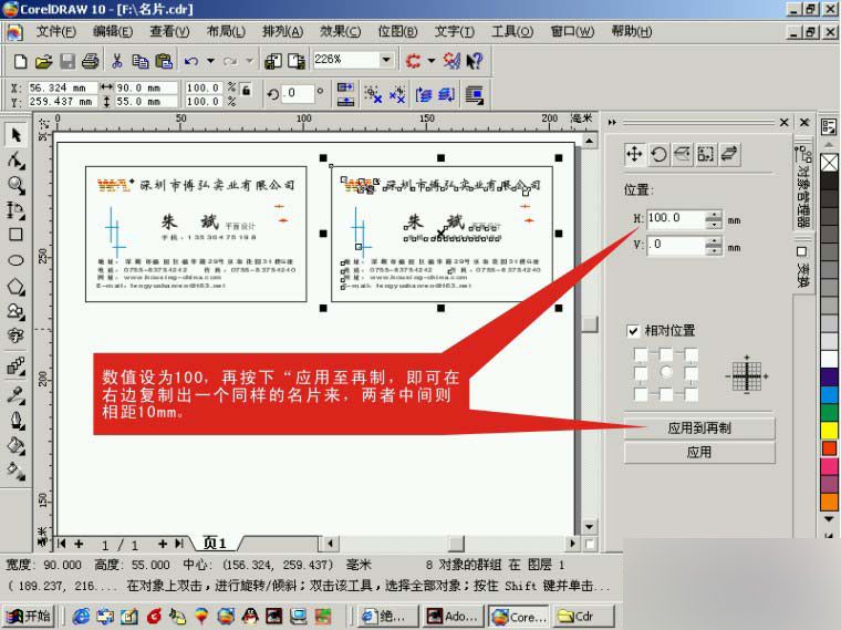 6、選中剛才做好的名片,按Ctrl+G或安排菜單中的群組,將他們組成一個對象以便后續工作的操作方便。將名片移到屏幕上的紙張(A4)左上角,按Alt+F7或選擇"排列"菜單中的"變換""位置"以彈出"變換"選項框選中對象,在位置水平項中設定數值為100,再按一下"應用至再制物件"即在右邊復制出一個相同的名片來,兩者中間則相距10mm,如圖3。