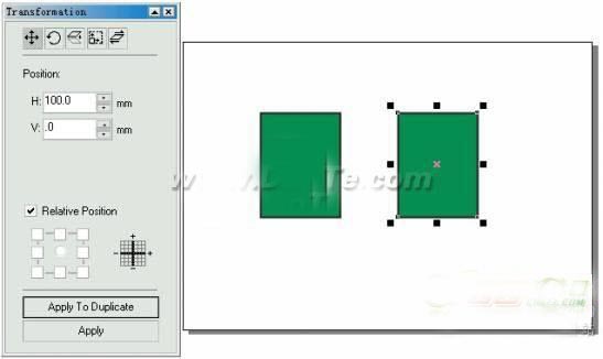 在Transformation (變換)面板中,.如果選中Relative Position(相對(duì)位置)復(fù)選項(xiàng),還可以將對(duì)象或其副本沿某一方向移動(dòng)到相對(duì)于原位置指定距離的新位置上去 。也就是說,將原對(duì)象的定位點(diǎn)作為相對(duì)的座標(biāo)原點(diǎn),直接輸入在各個(gè)方向要移動(dòng)距離的值即可。