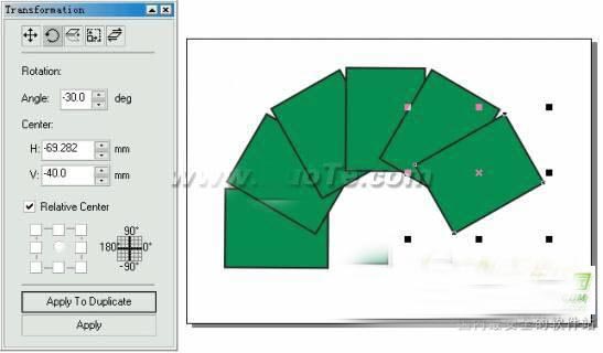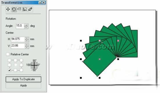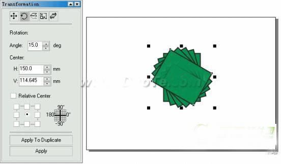 在Transformation (變換)面板中,還可以設(shè)置相對(duì)于當(dāng)前旋轉(zhuǎn)中心一定距離的點(diǎn)為定位點(diǎn)(相對(duì)中心點(diǎn)),使對(duì)象圍繞該定位 點(diǎn)旋轉(zhuǎn),會(huì)產(chǎn)生不同的效果。