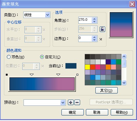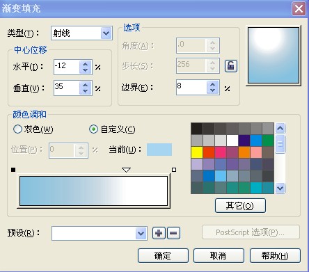 1、啟動coreldRAWx4,新建空白文件,在屬性欄設置寬“297MM”高“150MM”并填充顏色漸變,去除輪廓線,如下效果圖。