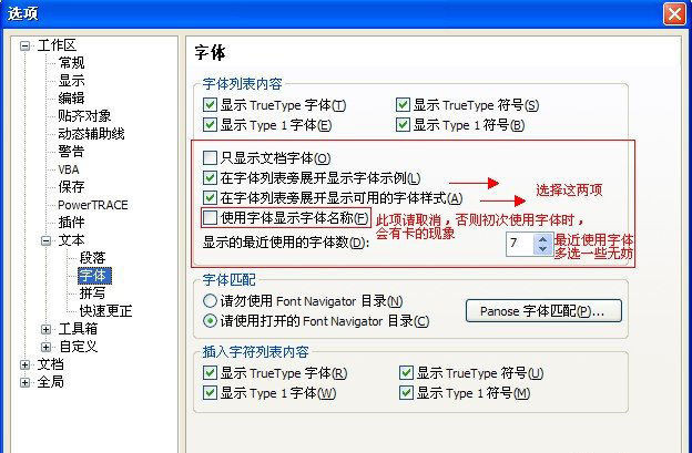 發(fā)現(xiàn)coreldraw x5切換字體卡的原因沒有?其實(shí)就在上面的"使用字體顯示字體名稱"那里,取消"使用字體顯示字體名稱"你就會(huì)發(fā)現(xiàn),你的coreldraw x5切換字體再也不卡了。
