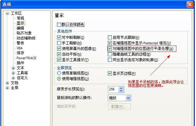 選擇是否對(duì)增強(qiáng)視圖中的位圖平滑處理,也對(duì)coreldraw x5的速度有影響。