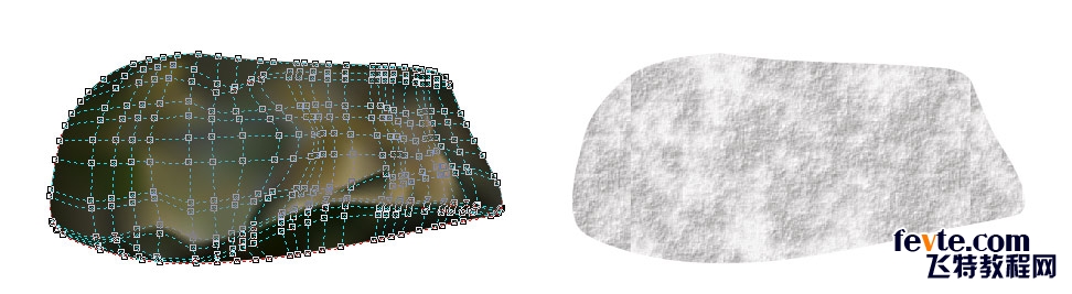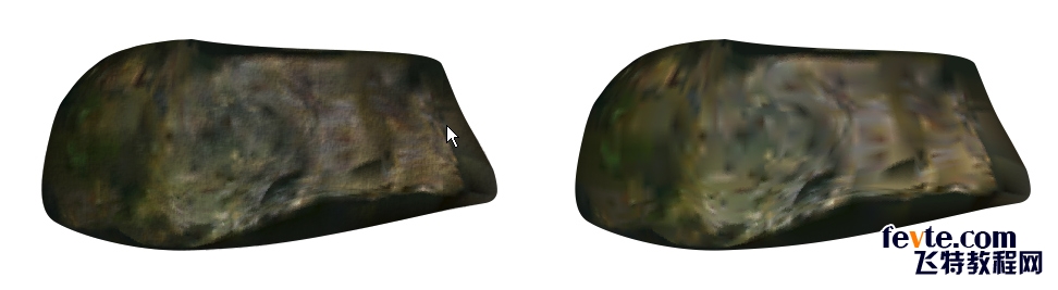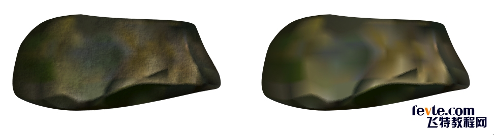 上面的早期石頭只有橫向24,縱向13的網格大小。疊加在網格對象上的材質是采用底紋填充里的月球表面,透明度操作"乘"。下面的后期刻畫石頭為了更多地表現石頭豐富的顏色及明暗變化,網格加大到橫向超過50,縱向44。上層疊加的材質對象不變。
