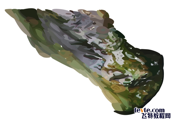 接著采用單一網格對象來表現高光石頭,剛開始還有興趣瞇縫著眼睛尋找石頭的主要明暗結構及顏色走向,但后來覺得石頭的顏色過渡和明暗實在太豐富細密,根本無從簡單地界定,于是干脆用小塊矩形網格對象來拼接,這樣反而省了揣摩的時間。下圖是稍早一點畫的單一網格反光石頭