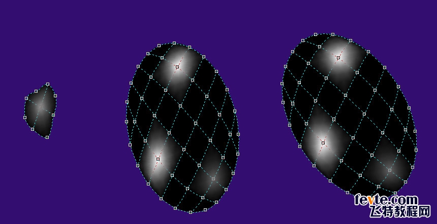 以上是3個網格對象沒設置透明時的樣子,可以看出,它們都是四周全黑,中間強度不同的白色。下面就是用這些網格小點透明并適當縮小后放到葉片上的效果。