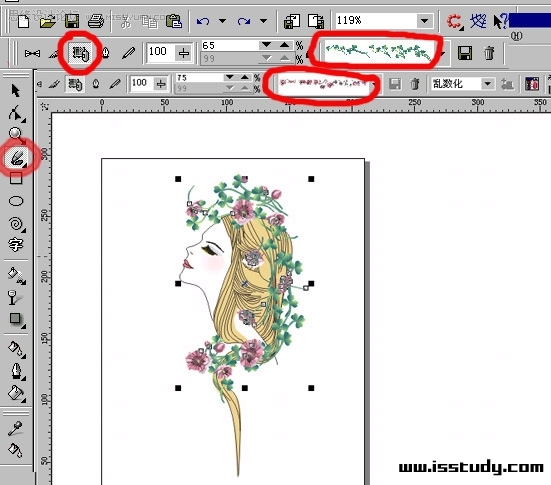 步驟三、群選眉毛、眼線和睫毛,選擇適合的藝術(shù)筆刷工具轉(zhuǎn)換線條