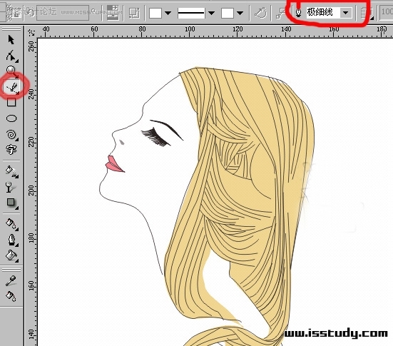 步驟一、選擇輪廓線工具線條粗細(xì)為極細(xì)線(方便勾線造型),然后用貝茲曲線工具打線稿,造型可盡量夸張一點(diǎn)