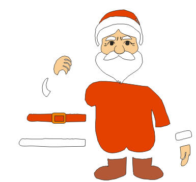 (4)依次繪出圣誕老人的衣服(紅色填充)、袖子(白色填充)、手(褐色填充)以及襪子(深紅色填充)。另外還要繪出圣誕老人的褲帶。如圖05所示。然后調整每件物品的前后順序并拼成如圖06所示。
