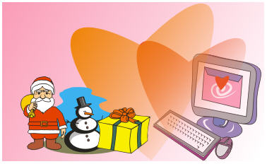 下面我們主要考慮用什么樣的圖案和顏色來表現,圣誕節來了,送上一張圣誕卡,圣誕老人的圖案當然少不了,而且是一個扛了一大袋禮物的那種。表達自己的思念,創意中提到的電腦當希望是少不了,要不然,她怎么會知道你是在電腦前想她呢!