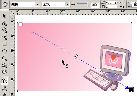 將距形填充為粉紅色,同時選擇“交互式透明工具”,并設置透明類型為“線型”,如圖14所示,讓靠近電腦的部分通過透明而呈現出來。