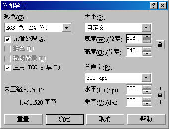 (3)在“位圖導出”對話框中設置各項參數,為了不影響輸出效果,分辨率最好設置高一點,色彩為“RGB色”,因為你的主要目的是在屏幕上顯示。如果你要改變大小,最好按長寬比例進行縮放,否則輸入的位圖就很可能變形。