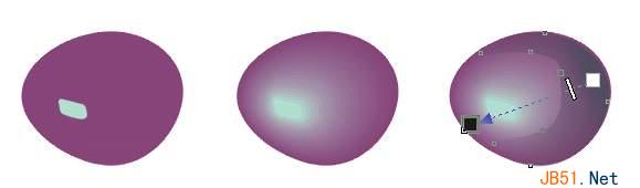 (8)制作一串葡萄,與前面制作的蘋果稍有不同,你要表現出它的晶瑩剔透的顏色來。你最好先在紙上畫出它的大概結構和形狀(最起碼也要在大腦中構思一下),這樣你在將這些葡萄顆粒組成一串葡萄時會覺得非常簡單,否則最后的排列組合工作會搞的你頭昏眼花!現在先來制作一個葡萄顆粒,還是先用一個橢圓形進行變形的方法制出它的輪廓,填充為深紫色(Deep River),然后在它上面畫出受光的部位,因為它和蘋果不同,它本身是略有透明的,所以反射出的光應該有它內部體液的顏色,這里我將它填充為青色(ghost Green);現在取消這兩個圖形的輪廓顏色,對它們進行20層的漸變操作;復制漸變組中的紫色圖形,重新填充為一種深的藍色(Deep Navy Blue),用造形工具將左面的節點向右推,把它加工成一個月牙狀的圖形;最后用互動式透明度工具給它加上透明度效果,效果不錯!這個葡萄看起來真的是熟透了,如圖: