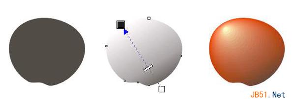 3)下面制作的是蘋果表面的陰影效果。選中蘋果的紅色輪廓圖形并按數字鍵盤上的+鍵將它復制,然后將復制的圖形移動到一邊;現在將復制圖形重新填充為黑色,選用互動式透明度工具點中黑色圖形右下方的一點并向左上方拖動,到達圖形邊緣時松開,這是一個黑色的半透明圖形;將半透明圖形放置在漸變圖形組的上面,你得到了期望的陰暗效果,如圖: