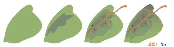 (6)在這個蘋果的葉柄上加上一片葉子。用貝茲曲線工具畫出葉子的輪廓,填充為葉綠色(Martian Green);然后將它復制并將復制對象縮小,然后設置復制對象的顏色為一種深綠色(Acocado Green);選取互動式變形工具選中它左邊邊緣一點并向左拖動,在屬性欄中單擊“推與拉變形”*按鈕,并設置“推與拉變形幅度”的值為-26,這樣做的目的是下一步執行漸變操作時能夠得到一個顏色自然過渡的圖形。現在取消它們的輪廓顏色,選取互動式漸變工具拖動變形的圖形到葉子的輪廓圖形上,設置“漸變的層次數”為1,這是一片有漸變顏色的葉子。用手繪工具在漸變組的表面畫出葉脈的形狀,并畫一些黑色的小橢圓形作為雜點散步在葉子上,最后在葉子的表面上也要加上一個半透明的輪廓圖形,這樣會使葉子的顏色看起來更有真實感,效果如圖: