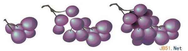 (9)做出來許多不同形態的葡萄顆粒組成一串葡萄,這需要一些必不可少的手工勞動。我的排列方法是這樣:先排列組成葡萄的下半部分,然后用手繪工具畫出一些枝干,將它們連接起來;再畫出上半部分靠在外邊的幾個顆粒和另一些枝干;最后在這些圖形的背后添加一些更深顏色的顆粒以產生前明后暗的景深效果,當然少不了一些細致的調節工作,過程可以參考下圖: