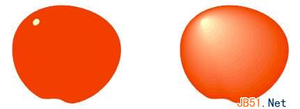 (2)填充為紅色,在它里面左上方的位置畫一個小圓,填充為淺黃色(Pale Yellow);選中這兩個圖形,右擊調色板中的無填充色塊取消它們的輪廓顏色,現在選取互動式漸變工具拖動小圓到大圓上,在屬性欄中設置“漸變的層次數”為20,現在我們制作出了蘋果表面的高亮效果,如圖:
