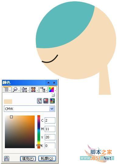選擇“橢圓工具”,繪制一個正圓,然后填充淺膚色(C:2,M:11,Y:20)并取消輪廓線,如圖2所示: