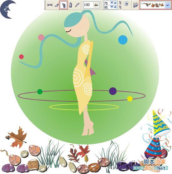單擊“藝術筆工具”/“噴罐”,在“噴涂列表文件列表”中選擇石頭、小草、楓葉、小卡通帽等藝術筆(我用的是CorelDRAW12版本)來繪制背景素材后,完成效果如圖16C所示: