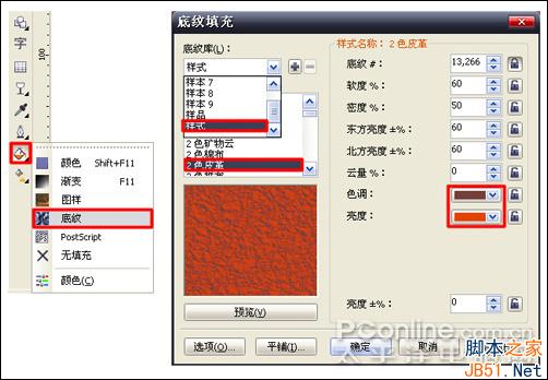3、在選中矩形的狀態(tài)下,選擇工具箱中的底紋填充工具,彈出底紋填充對話框,在底紋庫中選擇“樣式”選項(xiàng),再選擇樣式選項(xiàng)中的“2色皮革”,然后鼠標(biāo)點(diǎn)擊色調(diào)與亮度的下拉箭頭,彈出顏色選取器,色調(diào)與亮度的顏色分別選擇“褐色”和“紅色”,然后點(diǎn)擊確定完成設(shè)置,如圖3所示。