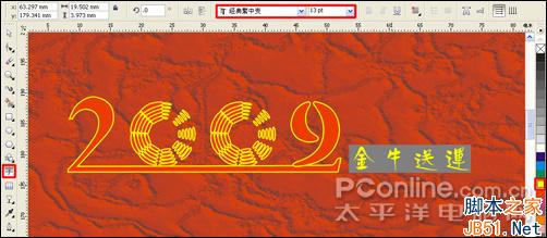 17、選擇工具箱中的文本工具,在“2009”后面輸入文字“金牛送運(yùn)”字樣,字體設(shè)置為:經(jīng)典繁中變,字號(hào)設(shè)置為:13pt,把文字填充為黃色,無輪廓填充,如圖17所示。