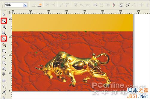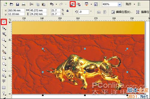 6、鼠標(biāo)單擊屬性欄上的“導(dǎo)入”按鈕(快捷鍵Ctrl+I),導(dǎo)入格式為PNG的素材圖片“牛”,將圖片縮放大小,拖動(dòng)到頁面的右下角處,再滾動(dòng)鼠標(biāo)滾輪放大頁面,作更好的調(diào)整,如圖6所示。