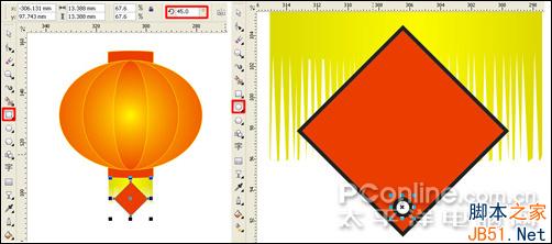 27、選擇工具箱中的矩形工具,按住Ctrl鍵在掛穗的位置拖曳一個(gè)小正方形,選中正方形,在屬性欄上旋轉(zhuǎn)角度處輸入:45度,把小正方形旋轉(zhuǎn)45度,單擊調(diào)色板上的紅色,把小正方形填充為紅色;再選擇工具箱中的橢圓形工具,在小正方形的下方繪制一個(gè)小圓形,如圖27所示。