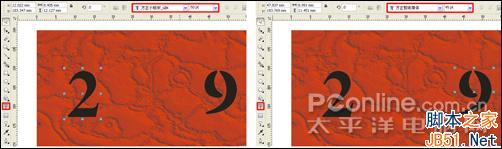 10、把頁面調(diào)整到左上角處,再滾動(dòng)鼠標(biāo)滾輪放大頁面,選擇工具箱中的文本工具,在頁面左上角處分別輸入字體為:方正小標(biāo)宋_GBK、字號(hào)為:50pt的數(shù)字“2”,和字體為:方正剪紙簡體、字號(hào)為:45pt的數(shù)字“9”,如圖10所示。