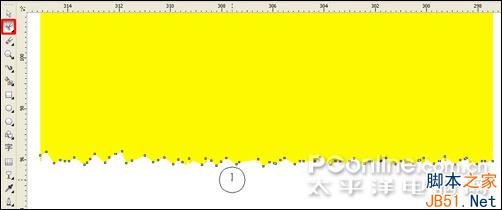 25、按組合鍵“Ctrl+Q”把矩形轉(zhuǎn)換為曲線后,滾動(dòng)鼠標(biāo)滾輪,放大頁面,選擇工具箱中的粗糙工具,在矩形的底部點(diǎn)擊,形成凹凸不平的效果,如圖25所示。