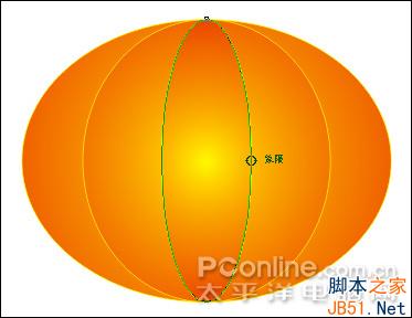 19、下面是燈籠的繪制。選擇工具箱中的橢圓形工具,在頁面上拖曳一個(gè)橢圓形,然后選擇工具箱中的漸變填充對話框工具,彈出漸變填充對話框,選擇漸變填充類型為:射線,顏色調(diào)和選擇:自定義,設(shè)置其漸變顏色由紅色到黃色,點(diǎn)擊確定完成設(shè)置并給橢圓填充漸變顏色,再右鍵點(diǎn)擊調(diào)色板上的黃色,把橢圓的輪廓顏色改變填充為黃色,如圖19所示。