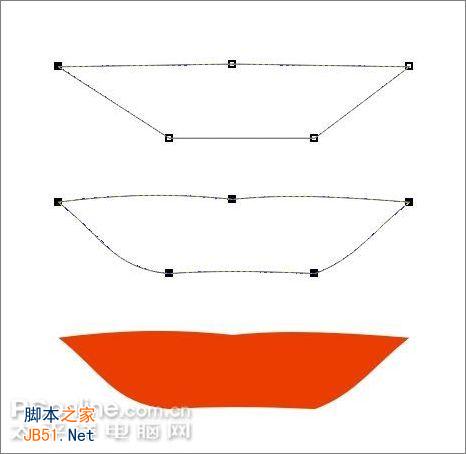 19、嘴唇。先用貝塞爾工具畫出如下五邊形,然后用形狀工具選中所有節(jié)點(diǎn),Ctrl+Q轉(zhuǎn)為曲線后調(diào)節(jié)為如下形狀,填充紅色,放在下巴之上。