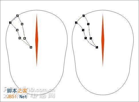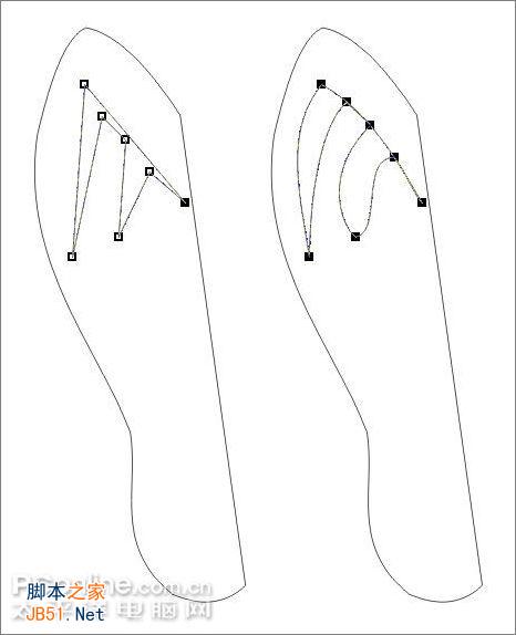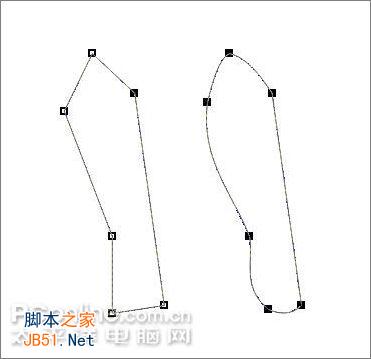 31、先用貝塞爾工具畫出如下直線輪廓,然后用形狀工具選中所有節(jié)點(diǎn),Ctrl+Q轉(zhuǎn)為曲線后調(diào)節(jié)為如下形狀。