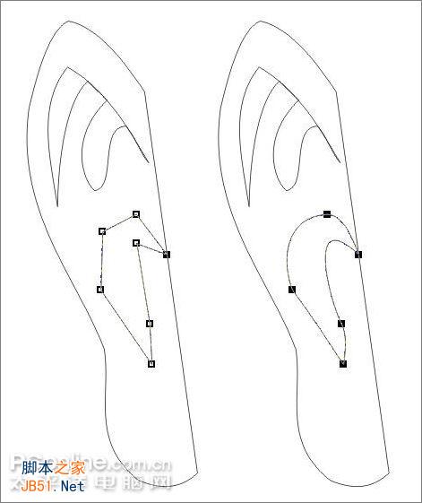 30、耳內(nèi)輪廓。先用貝塞爾工具畫出如下直線輪廓,然后用形狀工具選中所有節(jié)點(diǎn),Ctrl+Q轉(zhuǎn)為曲線后調(diào)節(jié)為如下形狀。