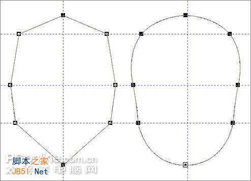 1、臉型。因?yàn)槟樧V是對(duì)稱結(jié)構(gòu),所以應(yīng)先拉幾條參考線確定中心點(diǎn)和幾個(gè)關(guān)鍵點(diǎn),然后用貝塞爾工具畫出直線輪廓,最后用形狀工具選中所有節(jié)點(diǎn),Ctrl+Q轉(zhuǎn)為曲線后調(diào)節(jié)曲線至如下形狀。