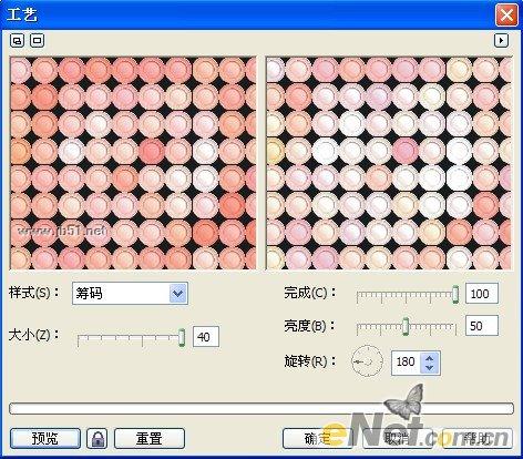 8.這時我們選中轉換后的圖像,執行“位圖”中“創造性”—“工藝”命令,在打開的對話框中設置“樣式”為“籌碼”,其他參數的設置如圖9、圖10: