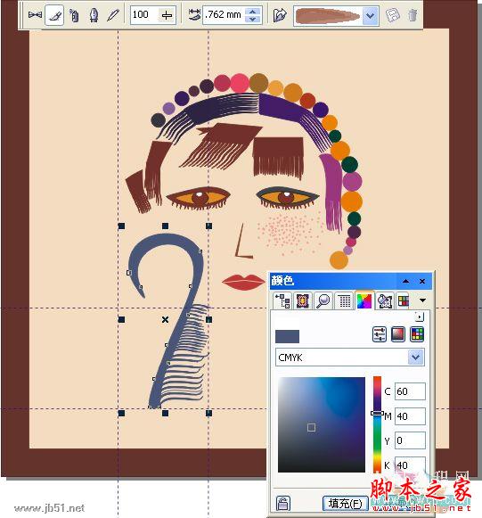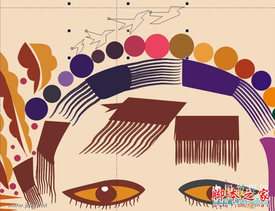 19、單擊“橢圓工具”繪制多個小圓形(24個)做為美女的頭飾,單擊“填充工具”分別為其填充顏色(顏色方案請自行進行協(xié)調(diào)搭配),效果如圖19A所示: