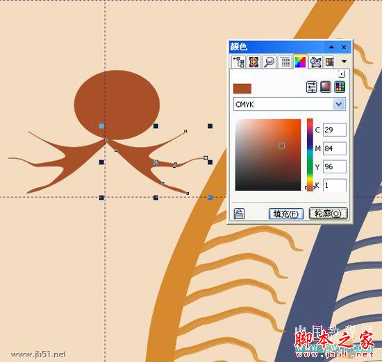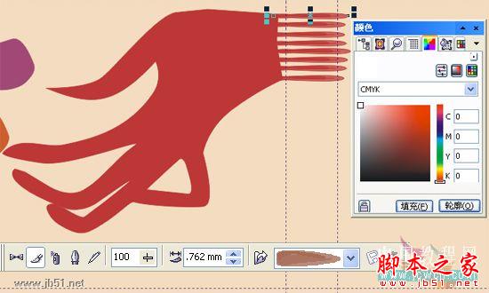 28、單擊“鋼筆工具”,創(chuàng)建圖形,單擊“形狀工具”進行調(diào)整;然后,選擇調(diào)色板中的相應(yīng)顏色,填充圖形。如圖28A所示: