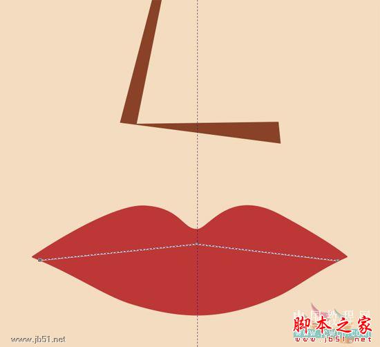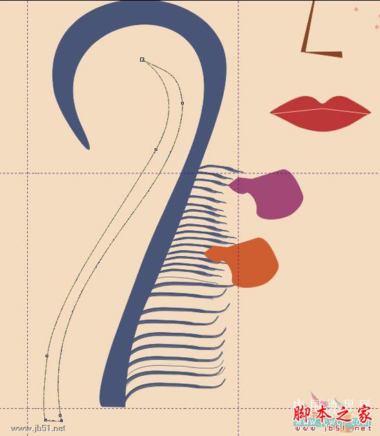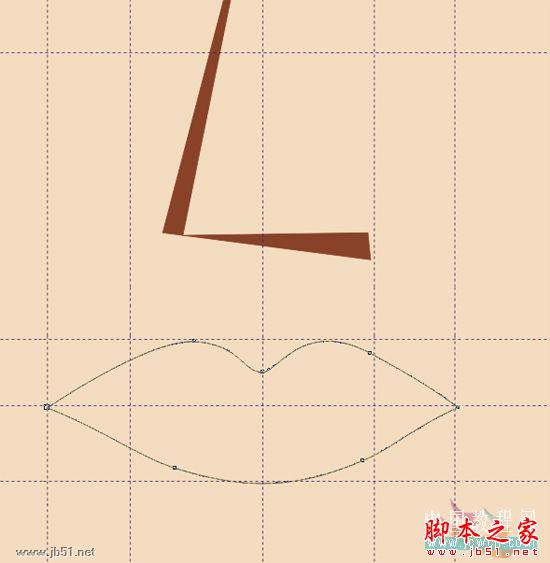 13、單擊“鋼筆工具”,創(chuàng)建嘴唇的圖形輪廓,運用“鋼筆工具”創(chuàng)建的圖形需結(jié)合“形狀工具”,在所需調(diào)節(jié)的點上單擊鼠標右鍵選擇“曲線”(或稱為“反轉(zhuǎn)曲線”)命令,進行圓滑調(diào)節(jié)(請適當拉標尺線進行定位繪畫),如圖13A所示: