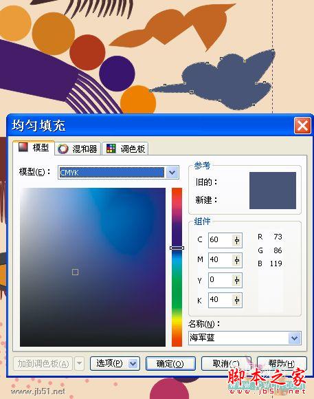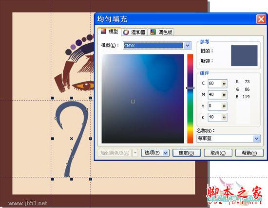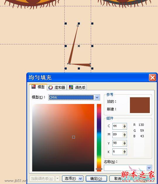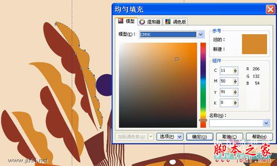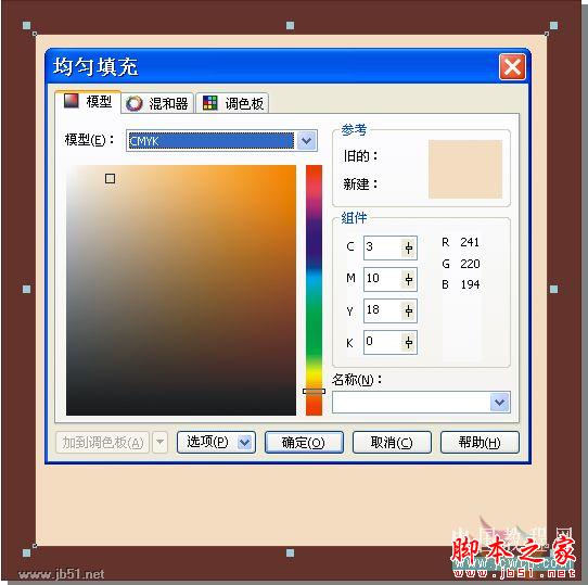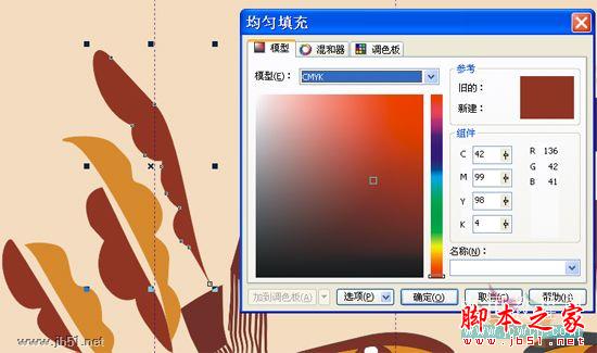 2、雙擊“矩形工具”創(chuàng)建一個與文檔同樣大小的矩形,并將其填充(按Shift+F11組合鍵,彈出“均勻填充”對話框)為朱褐色(C:60,M:93,Y:93,K:19),輪廓線也填充為朱褐色。如圖2所示: