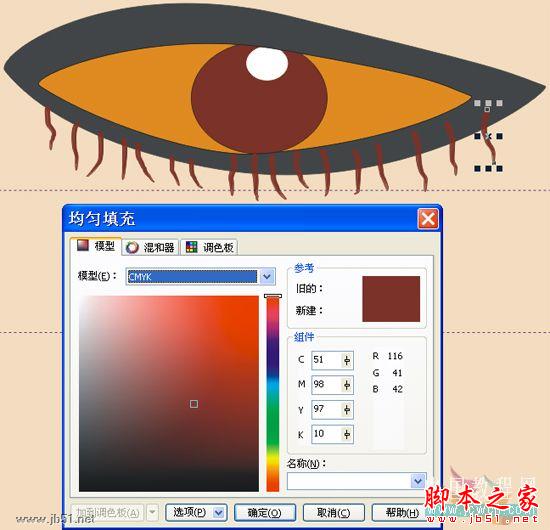 10、將5-9步驟中創(chuàng)建好的右眼圖形復(fù)制一份,作為左眼圖形,全部選擇后,按“鏡像”按鈕,將眼眶填充顏色為(C:51;M:98;Y:97;K:10),其輪廓線也進行相應(yīng)的填充,如圖10A所示: