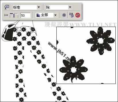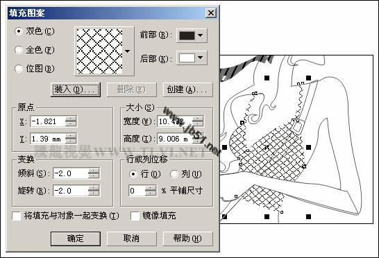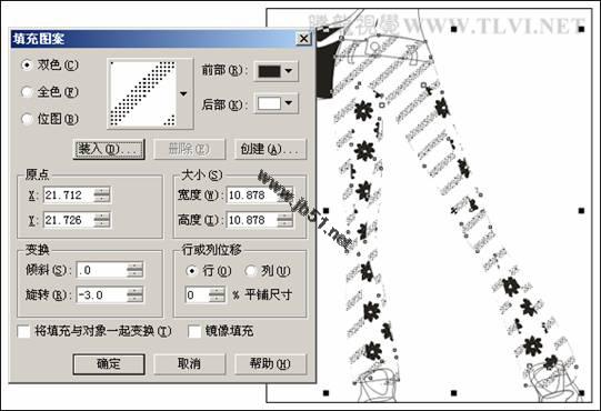 (8)選擇褲子圖形,將其再制并放置到頁(yè)面空白處,以便下面再對(duì)其進(jìn)行編輯。然后參照?qǐng)D5-10所示設(shè)置"填充圖案"對(duì)話框,為原褲子圖形填充圖案,并設(shè)置褲子圖形的輪廓色為無(wú)。