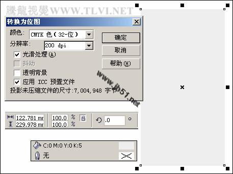 (9)使用"矩形"工具,在頁(yè)面空白處繪制一個(gè)矩形,設(shè)置填充色為灰色,輪廓色為無(wú)。然后執(zhí)行"位圖"→"轉(zhuǎn)換為位圖"命令,打開(kāi)"轉(zhuǎn)換為位圖"對(duì)話框,參照?qǐng)D5-11所示設(shè)置對(duì)話框,將矩形轉(zhuǎn)換為位圖。