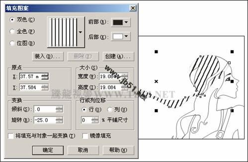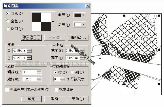 (14)調(diào)整修剪后圖形的位置與順序,然后參照?qǐng)D5-16所示設(shè)置"填充圖案"對(duì)話框,為其填充圖案,并設(shè)置輪廓色為無(wú)。