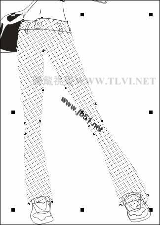 (11)將網(wǎng)點(diǎn)圖像再制,執(zhí)行"效果"→"圖框精確剪裁"→"放置在容器中"命令,當(dāng)鼠標(biāo)出現(xiàn)黑色箭頭時(shí),單擊褲子輪廓圖形,將網(wǎng)點(diǎn)圖像放置到褲子輪廓圖形當(dāng)中,如圖5-13所示。