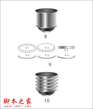 9.螺絲部分:畫兩個橢圓,修剪工具,修剪后得到如(圖3)9.4再相交得到如(圖3)9.5,填充上面一層填充漸變,如(圖3)9.3底下一層填充K40, 得到如(圖3)9.6