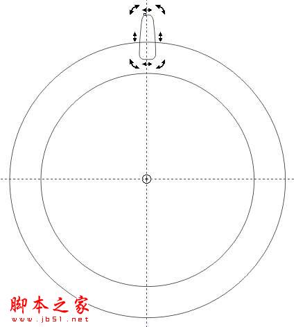 (4)下面的工作你可能已經猜測到了,我們要這個小輪齒沿著輪盤的輪廓進行旋轉復制,得到一個輪齒密集的齒輪;在旋轉這個小輪齒之前,要確保它的旋轉軸心和輪盤的中心在同一坐標點上。現在使用Pick Tool單擊這個輪盤,顯現出它的中心;然后從視圖邊緣標尺的地方分別拖出一條水平的和一條垂直的輔助線,使它們相交在輪盤的中心上;接著兩次單擊小輪齒,顯現出它的旋轉軸心,并將此軸心移到輔助線相交的地方,如圖。