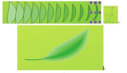 步驟四、制作一些飄落的葉子,先用貝塞爾曲線畫一個大的,這個稍微得用節點調整了,然后復制一個小的,適當調一下顏色,然后做交互式調和,步長設得多些效果會更好些,如圖所示: