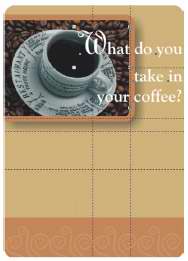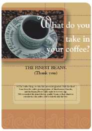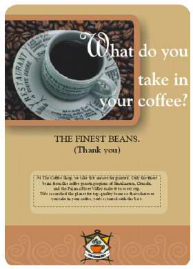 這張廣告要表達的信息是這個咖啡店里的產品均出自品質上乘的咖啡豆。一張位于大堆咖啡豆上的一杯咖啡的圖片就能很好的表達這個意圖。