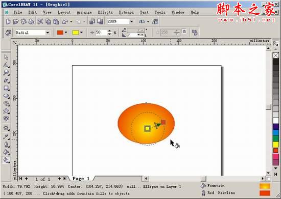 3.這時候的填充,可能你還不太滿意,可以選擇Fill Tool下面的Interactive Fill Tool來調整。這是Coreldraw獨一無二的交互式填充工具,你可以即時看到效果,十分方便。調整在橢圓上顯示的色塊和箭頭,使它如圖所示。(3)