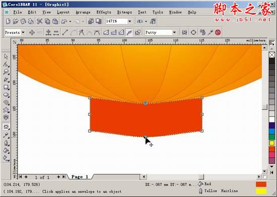 5.用Rectangle Tool畫一個小的長方形,作為燈籠的口。邊框選擇Yellow,內部填充Red。用Interactive Envelope Tool給它加上封套。選擇窗口上屬性條里的Envelope Unconstrained Mode,調整矩形中間的兩個點,使它看上去有些弧度,這樣會更真實、自然一些。(6)用同樣的手法做出上面的口,翻轉一下放在燈籠上。如圖(7)